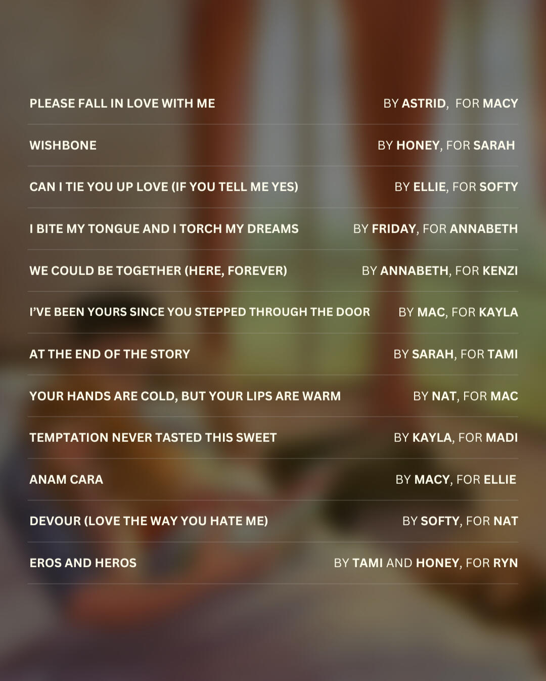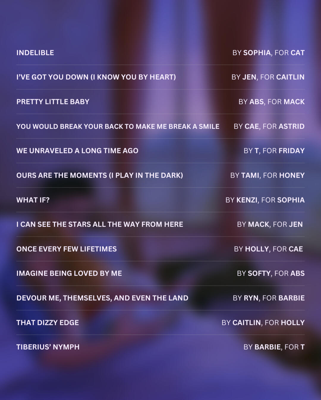 Writers were tasked to submit a song prompt and receive someone else's song prompt in exchange. The result was over 500 thousand words across 25 different works.
